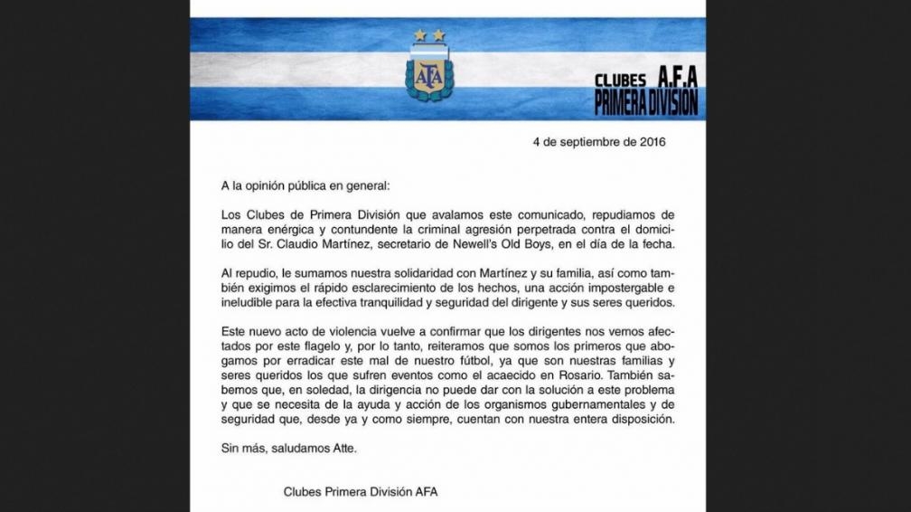 Los clubes de Primera División del fútbol argentino repudiaron este domingo el ataque sufrido por el secretario de Newell's Old Boys, Claudio Martínez, y exigieron ayuda del Gobierno para "erradicar" la violencia.