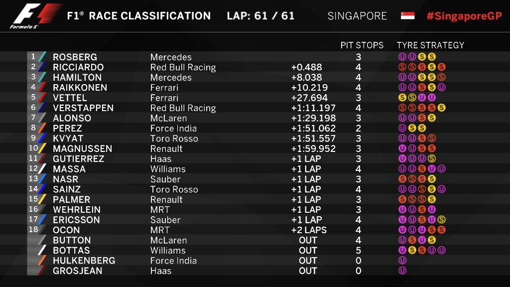 Rosberg consiguió una victoria de principio a fin en el circuito urbano de Marina Bay. Salió primero y terminó igual, dando una lección de cómo gestionar el desgaste de los neumáticos y el sobrecalentamiento de los frenos desde la primera vuelta.