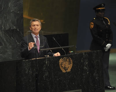 De traje oscuro y corbata roja, Macri dio su primer discurso -duró poco más de 15 minutos- luego de escuchar a todos los Jefes de Estado sentado en los escritorios asignados a la delegación de la Argentina en el tradicional salón verde y dorado de la Asamblea General.
