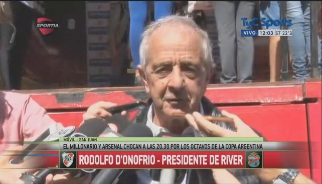 El presidente de River, Rodolfo D'Onofrio, habló sobre la actualidad del equipo en su llegada a San Juan para el duelo de esta noche, por Copa Argentina, ante Arsenal.