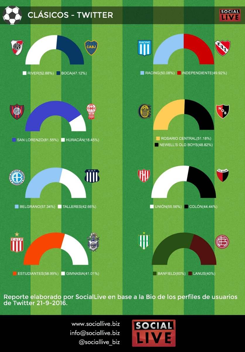 La consultora SocialLive publicó un informe tras analizar las biografías de los usuarios de la red social twitter para determinar quiénes tienen màs hinchas declarados en el fútbol argentino.