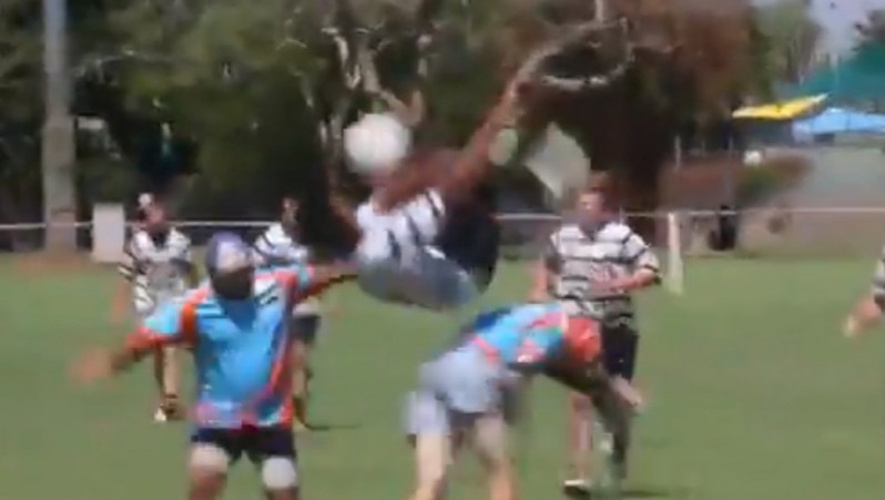 El protagonista de las imágenes es Quindan Smith, jugador de los Nines Kununurra en la Liga de rugby de Kimberly, que fue filmado saltando por encima de un defensor justo antes de que lo tumbe de un tackle.