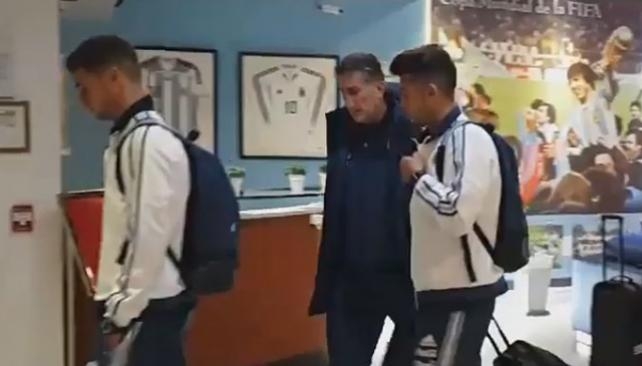 Los jugadores del fútbol local, Mariano Andújar, Emmanuel Mas y Lucas Alario, junto al entrenador, dejaron el predio de Ezeiza para partir rumbo a Lima.