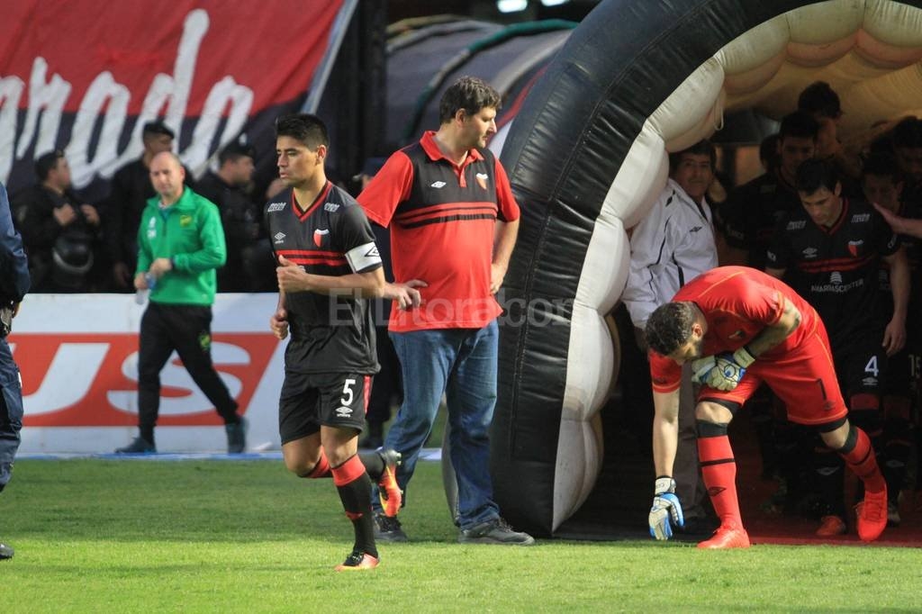 El capitán y la figura. Pisa con firmeza el campo de juego el capitán rojinegro, Gerónimo Poblete, mientras atrás toca el césped para darle suerte (y vaya si lo hizo) el arquero Jorge Broun, figura ante Defensa y Justicia. Ambos son pilares fundamentales en el equipo de Montero. Foto: Pablo Aguirre.