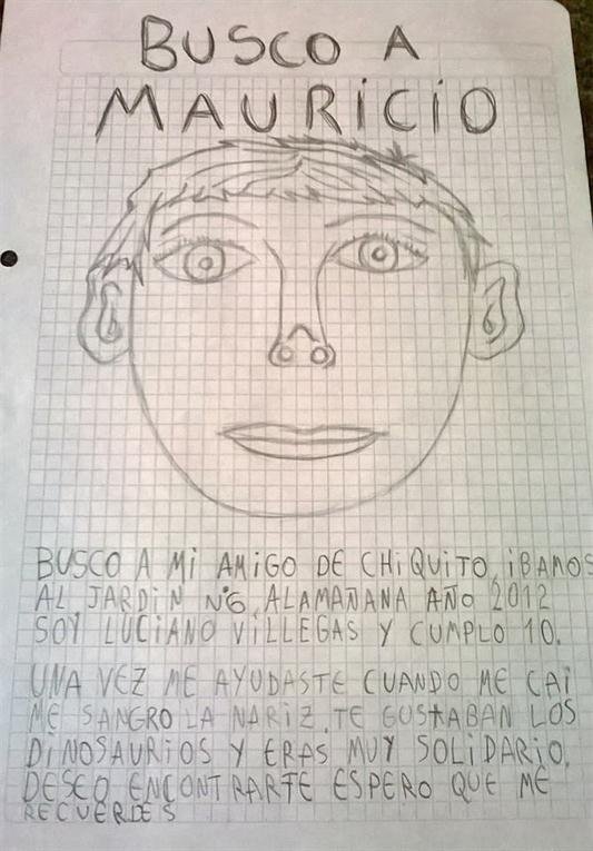 "Una vez me ayudaste cuando me sangró la nariz. Te gustan los dinosaurios y eras muy solidario. Deseo encontrarte, espero que me recuerdes". Así finaliza el texto que acompaña un identikit que Luciano dibujó para encontrar a su amigo del jardín, Mauricio.