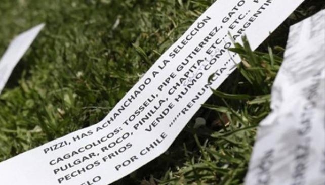 Es por eso que en las últimas horas se tiraron por las calles chilenas panfletos contra el actual DT. ¿Qué decían? "Pizzi, has achanchado a la selección. Cagacolicos: Tosseli, Pipe Gutiérrez, Gato Silva, Pulgar, Roco, Pinilla, Chapita, Etc...etc..puros pechos fríos. Vende humo como argentino. Haslo por Chile renuncia" (SIC).