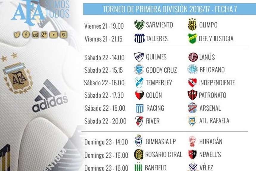 La AFA difundió los días y horarios de los partidos de la séptima fecha del torneo de Primera División. El programa es el siguiente.