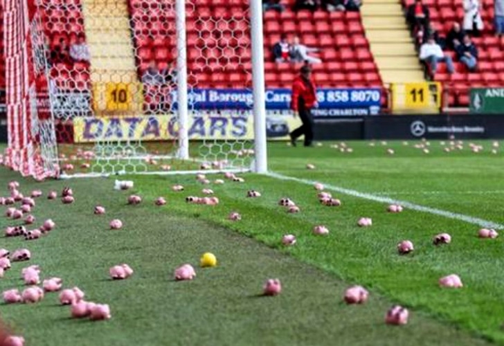 Sucedió en un duelo de la tercera división del fútbol inglés. Un hecho insólito: una lluvia de cerdos interrumpió el juego durante varios minutos entre Charlton Athletic y el Coventry City.