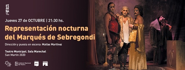 El Teatro Municipal “1° de Mayo” formará parte del Circuito del INT, que desde el 9 de septiembre y hasta el 30 de octubre llega a las distintas regiones del país, con 160 funciones, protagonizadas por elencos nacionales e internacionales. Como parte de esa extensa programación, el jueves 27 de octubre a las 21.30, la Sala Marechal recibe la obra “Representación Nocturna del Marqués de Sebregondi”, con texto, dirección y puesta en escena de Matías Martínez. Las interpretaciones están a cargo del grupo Sociedad Secreta de Actuación, integrado por el propio autor de la puesta, junto a Martín Fumiato y Matías Tamburri, quien interpreta además el piano.
