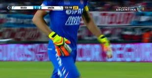 Un pelotazo largo de Unión agarró mal parada a la defensa de River y dejó a Lucas Gamba corriendo en soledad en busca del balón. Sin embargo, Augusto Batalla salió a cortar afuera del área y chocó al delantero del Tatengue, aunque Federico Beligoy no cobró la infracción y despertó el reclamo airado de todo el equipo.