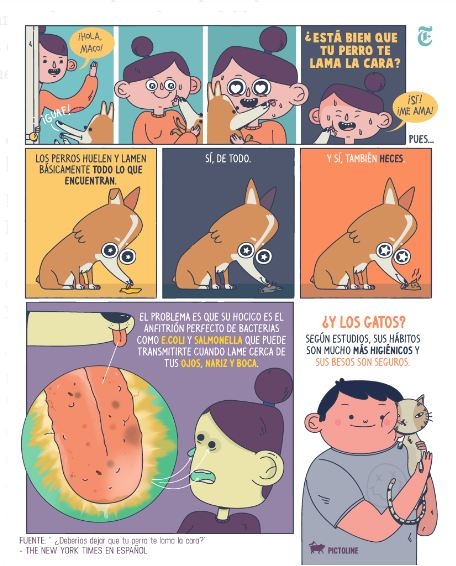 “No solo se trata de lo que hay en la saliva” explicó. “Los perros pasan la mitad de su vida poniendo la nariz en lugares muy desagradables o acercándose a oler excrementos de perros, por lo que sus hocicos están llenos de bacterias, virus y gérmenes de todo tipo”.