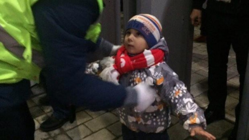 Se trata de la fotografía de un niño de 2 o 3 años ataviado con la bufanda del Spartak siendo cacheado por un miembro de seguridad en la puerta del estadio.