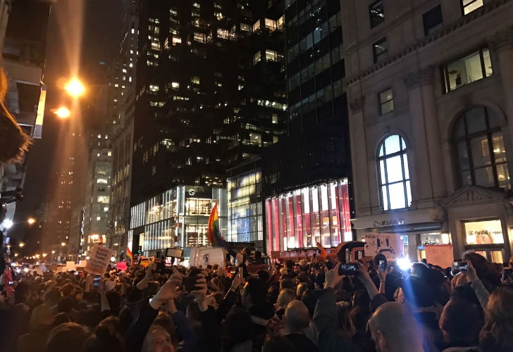 En Nueva York, los manifestantes se reunieron en Union Square con carteles en los que se leía "Love Trump Hate" (Ama, Trump Odia) y "Trump Grabbed America by the Pussy!" (Trump tomó a EEUU por la vulva) dirigiéndose luego hacia el edificio Trump Tower.