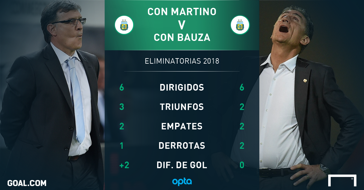 Con los tres puntos conseguidos contra el equipo de José Pekerman, la Albiceleste sumó ocho unidades sobre 18 de la mano de su actual entrenador, tres menos de las que había cosechado con el Tata, y está dos posiciones por debajo de lo que estaba antes del encuentro contra Uruguay en el que debutó el DT. Con Martino, el equipo había conseguido tres triunfos, dos empates y una caída, mientras que con Bauza el rendimiento es de dos victorias, dos igualdades y dos caídas. En cuanto a los goles, la relación de fuerzas también favorece al técnico anterior: con el Tata el equipo sumó seis tantos a favor y cuatro en contra, mientras que con el Patón si bien aumentó la cifra de gritos a ocho, se duplicó la vulnerabilidad de la defensa (le marcaron ocho veces).