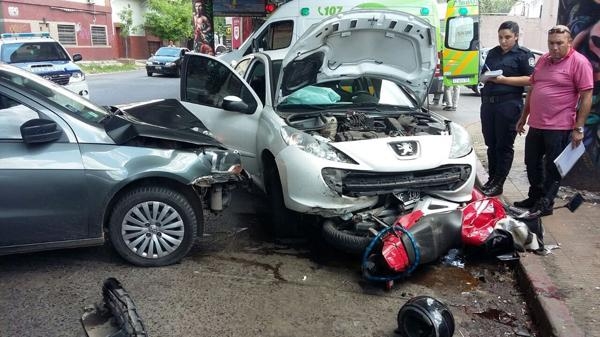 En ese momento, dos hombres le rompieron el vidrio del conductor, le arrebataron la mochila y empezaron el escape. Al percatarse, el asaltado aceleró y a los pocos metros impactó con el otro ladrón que estaba arriba de la moto. Fue tan brusca la aceleración que un Volkswagen Voyage de color gris que venía por la otra calle chocó al auto de la víctima.