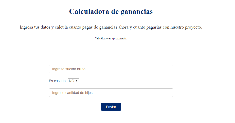 La calculadora requiere introducir el sueldo bruto, el estado civil y la cantidad de hijos. Una vez completados los datos, se arroja la cifra que pagaría en concepto de Ganancias con el proyecto del Frente Renovador y la comparación con el oficial. Además, hace el cálculo mensual y anual de dicha diferencia.