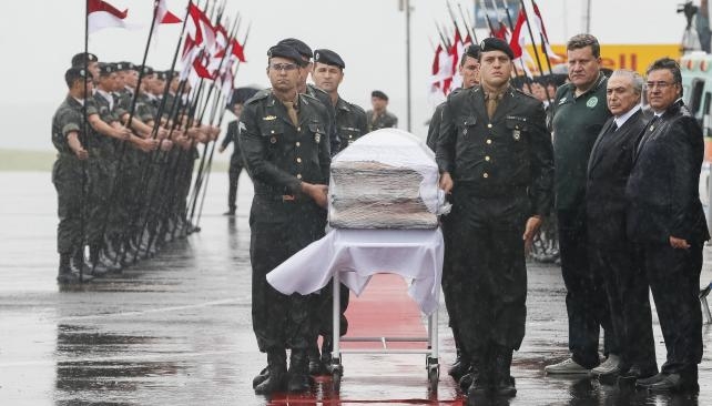 Los cuerpos de las 51 víctimas de la delegación de Chapecoense llegaron esta mañana al aeropuerto de Bertaso, donde fueron recibidos por el presidente Michel Temer. Desde allí los trasladaron al estadio Arena Condá, donde los esperaba una multitud.