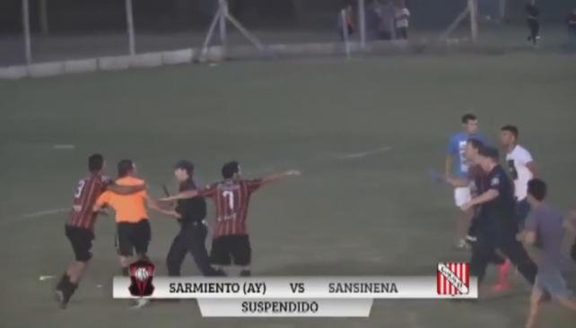 La violencia vuelve a ser protagonista del fútbol argentino. En el encuentro correspondiente a la vuelta de una de las semifinales del Torneo Federal B, entre Sarmiento de Ayacucho y Sansinena, el juez Claudio Elichiri y sus asistentes Juan Chaparro y Juan Bardas fueron salvajemente agredidos, luego del segundo gol del equipo visitante y la posterior suspensión del encuentro.