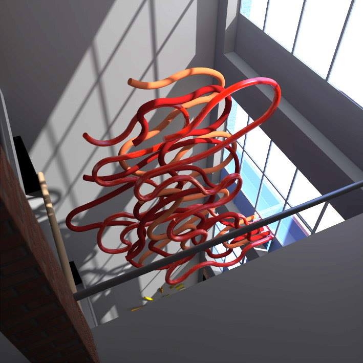 > Cuerdas flotantes: 7 tubos que representan no solo los sonidos de la escala diatónica sino que también, al estar suspendidos, remiten a la “teoría de las cuerdas”.