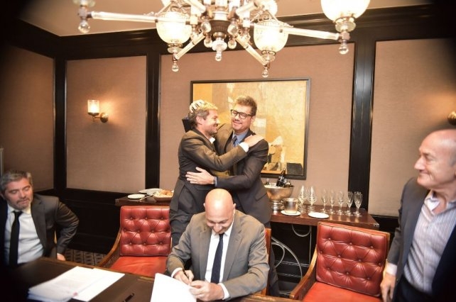 El presidente de San Lorenzo, Matías Lammens, y el vice Marcelo Tinelli, firmaron el boleto de compraventa de los terrenos de Boedo donde estaba el viejo Gasómetro (hasta 1979) y luego perteneció al supermercado francés Carrefour.