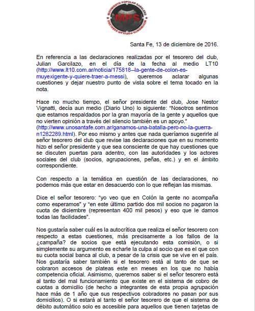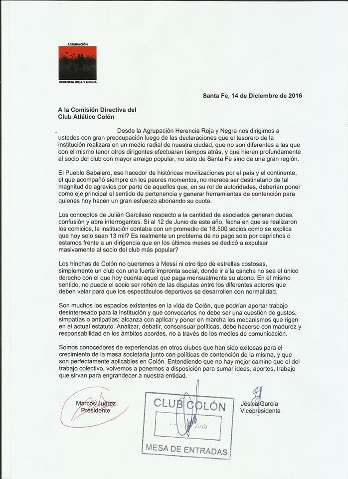 Desde la Agrupación Herencia Roja y Negra nos dirigimos a ustedes con gran preocupación luego de las declaraciones que el tesorero de la institución realizara en un medio radial de nuestra ciudad, que no son diferentes a las que con el mismo tenor otros dirigentes efectuaran tiempos atrás, y que hieren profundamente al socio del club con mayor arraigo popular, no solo de Santa Fe sino de una gran región.