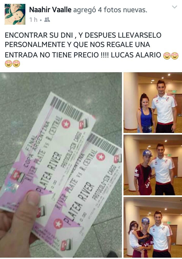 La llegada de River al hotel Sheraton fue en medio de la pasión de los hinchas del Millonario. Y en medio de ese furor a Lucas Alario se le cayó el DNI. Según cuentan dos hinchas, que lo publicaron en Facebook, le recuperaron el documento al delantero y Alario les regaló dos plateas.
