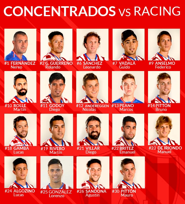 Juan Pablo Pumpido elevó la lista de concentrados para recibir este sábado desde las 18.15 a Racing, en el estadio 15 de Abril, con un cambio con respecto a la que se dio en un primer momento, ya que ingresará Lorenzo Gonzalez por Walter Bracamonte, quien se retiró del partido de Reserva con una molestia.