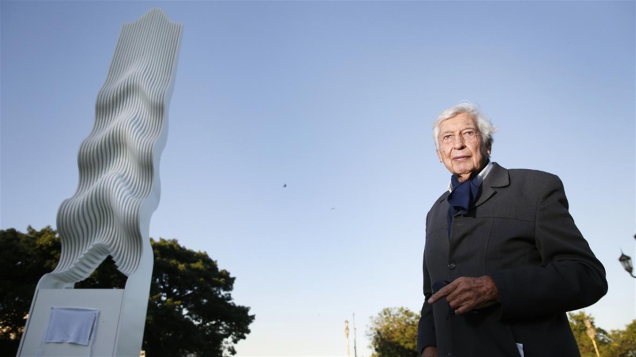 De unos cuatro metros de cuerpo, y apoyada sobre un pie que la eleva otros dos, la escultura Hacia la luz es aluminio puro, pintado de blanco, y su extremo señala lo alto. ¿Se inspiró en el Obelisco? "Puede vincularse con un obelisco, pero no pensé en eso. Es una misma forma -una onda-, que se repite. Desde donde se la mire es igual", explica el artista, muy activo a los 87 años.