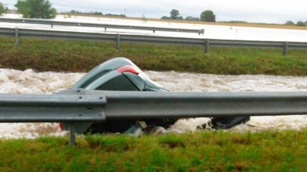 El accidente se produjo alrededor de las 2:40 de este lunes a la altura del kilómetro 208 de la ruta nacional 9. El auto, un Volkswagen Voyage de color gris, salió de la cinta asfáltica que estaba cubierta de agua y cayó a las torrentosas aguas del arroyo.