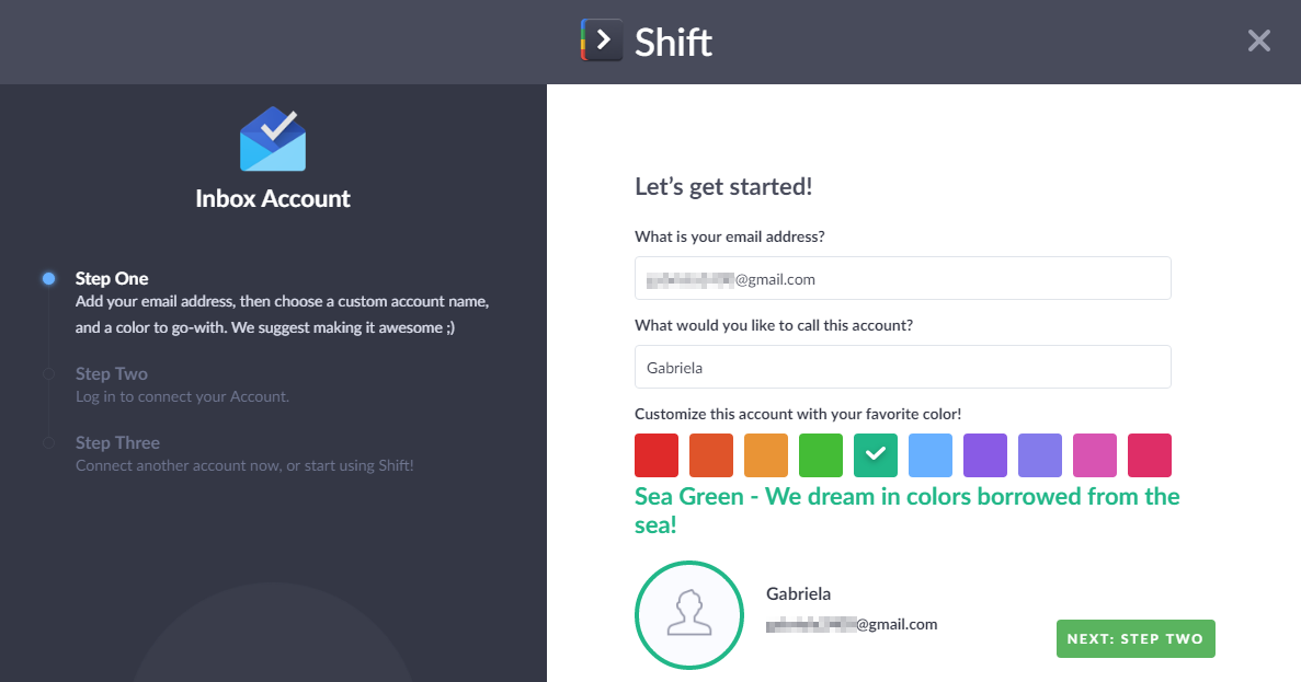 Al iniciar por primera vez la aplicación podrás elegir si quieres ver la interfaz de Gmail o Inbox para el correo de Google, y también añadir cuentas de Outlook. Cada cuenta puede tener un color y nombres personalizados. El proceso de autenticación es sumamente rápido y simple y directamente desde las webs de Gmail y Outlook.