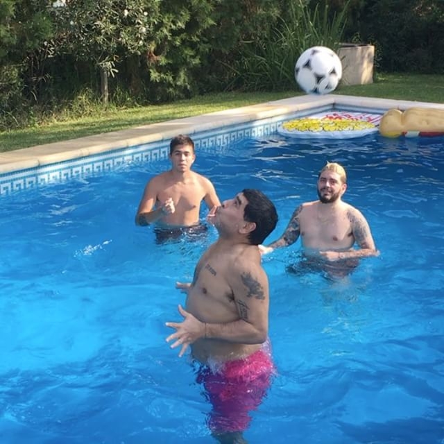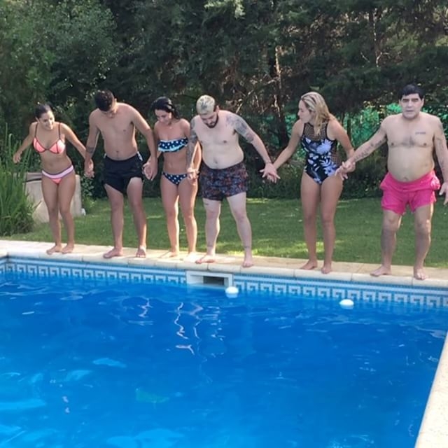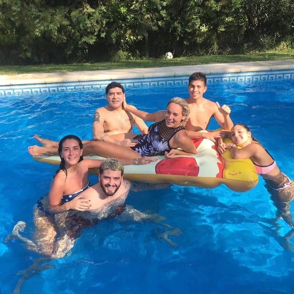 Diego Maradona disfrutó un gran día de intenso calor junto a Rocío Oliva (pareja), Diego Jr, Nunzia Pennino (nuera), Jana y Gabriel Pagani (yerno) y despidieron el 2016 con un piletazo en una casa ubicada en un country de Bella Vista.