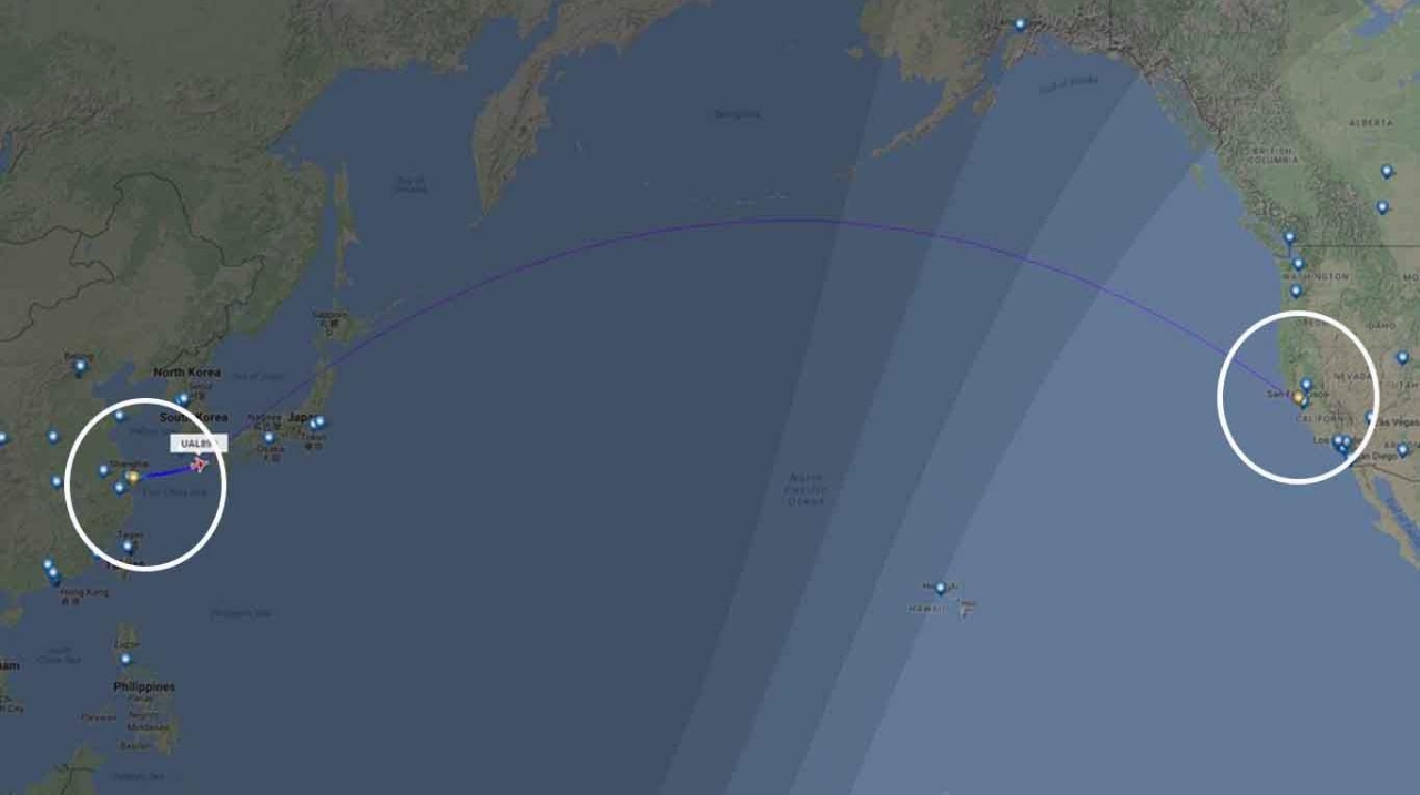 De acuerdo a los datos entregados por la cuenta de Twitter especializada Flightradar 24, que monitorea en vivo todos los vuelos en el mundo, el avión de United Airlines despegó a las 00.20 del domingo 1 de enero desde el aeropuerto de Shanghai (China) y aterrizó en San Francisco(Estados Unidos) a las 18.54 del sábado 31 de diciembre.