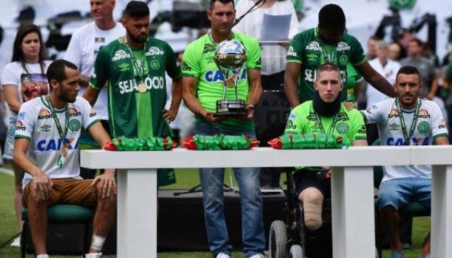 Antes del juego los tres jugadores sobrevivientes -Hélio Neto, Alan Ruschel y Jackson Follmann, arquero suplente al que debieron amputarle una pierna- recibieron la Copa Sudamericana.