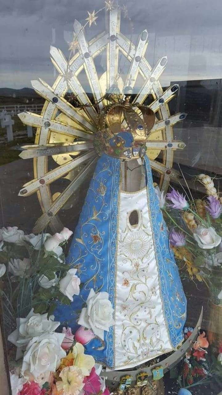 La denuncia fue presentada ante la Cancillería acreditando las pruebas de cómo le habían roto el vidrio a la virgen de Luján que se encuentra en la parte trasera de las 237 tumbas de Darwin, donde se encuentra el cenotafio y como coronando el lugar. Según la Comisión, a la virgen le robaron parte del cuerpo y no aparece. Y no se llevaron nada de valor.