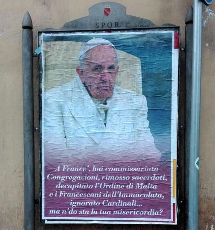 La capital italiana amaneció con decenas de afiches en los que se critica al Papa Francisco por una serie de medidas eclesiásticas adoptadas en los últimos meses.