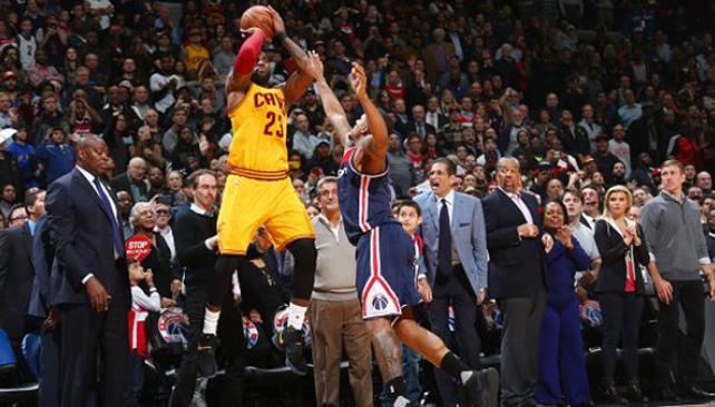 El astro de Cleveland convirtió para igualar el encuentro ante Washington en 120 y llevarlo a tiempo suplementario. Luego su equipo ganó 140 a 135 en un encuentro vibrante.