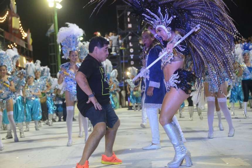 Con los cortos puestos, Diego Maradona solía sacar a bailar a sus adversarios. Ahora, con los cortos puestos y un par de años más, saca a bailar a las damas más bonitas del Carnaval correntino. Y no es exageración...