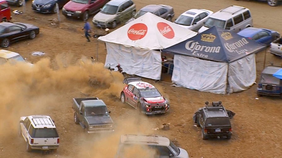 Un Meeke desorientado rodó alrededor de los vehículos estacionados buscando el camino de regreso a la carretera. Tras comprobar que su coche estaba bien, volvió a la pista y llegó al final con un pinchazo y la cinta de seguridad en el alerón trasero de su coche.