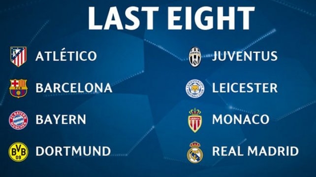 El viernes 17 de marzo se llevará a cabo el sorteo a las 12 horas de Suiza (8 de la Argentina). Los equipos clasificados son: Real Madrid, Barcelona, Bayern Munich, Dortmund, Juventus, Leicester, Atlético de Madrid y Mónaco.