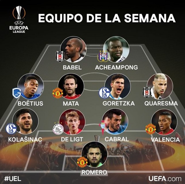 El arquero de Manchester United de Inglaterra, Sergio Romero, fue incluido hoy en el equipo ideal de la Europa League, por elección de UEFA, tras la conclusión de los octavos de final.