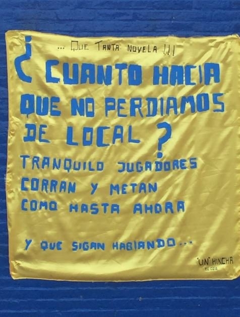 "Cuánto hacía que no perdíamos de local? Tranquilos jugadores, corran y metan como hasta ahora... y que sigan hablando", expresó en uno de los trapos, mientras que en otro se encargó de dejar en claro los logros de los últimos tiempos.