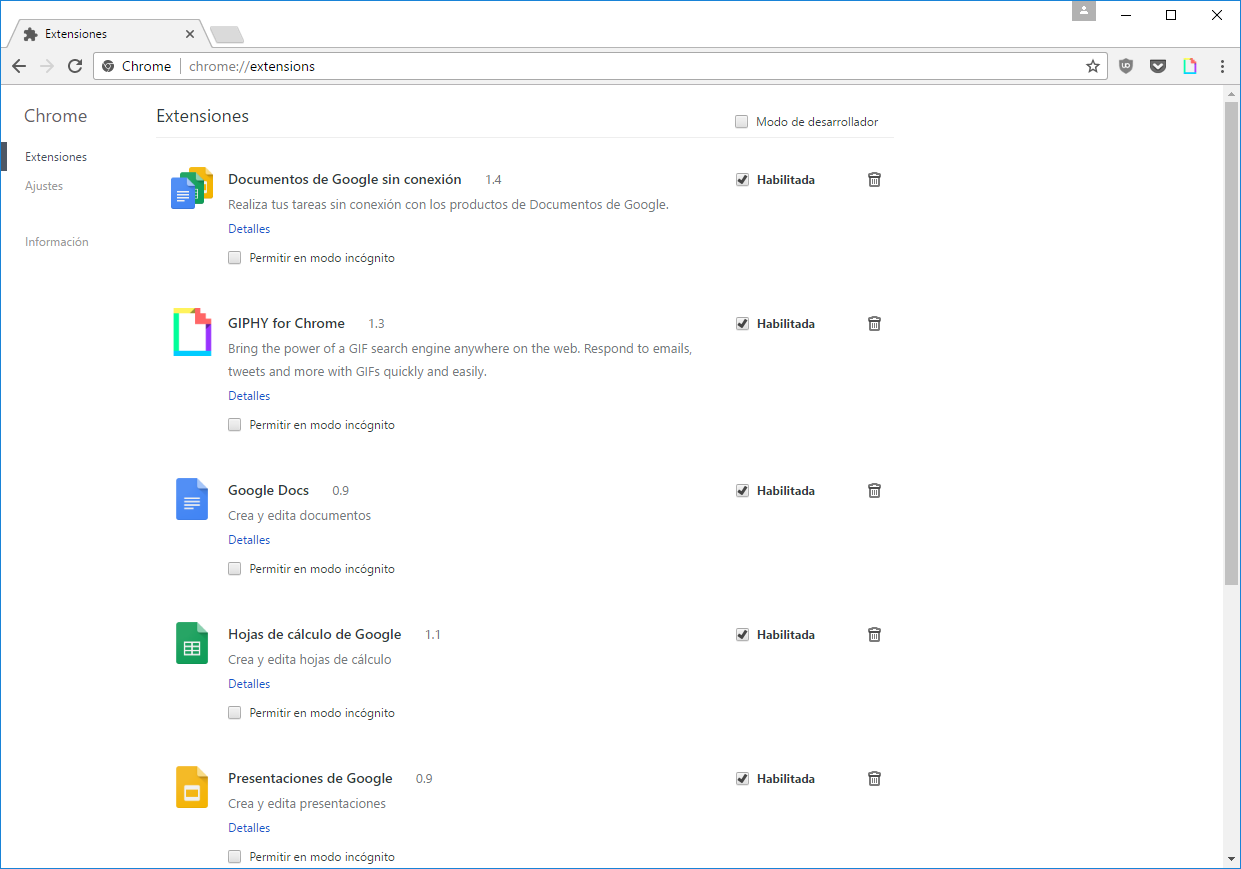 En este apartado veremos una lista de todas las extensiones instaladas en nuestro navegador: