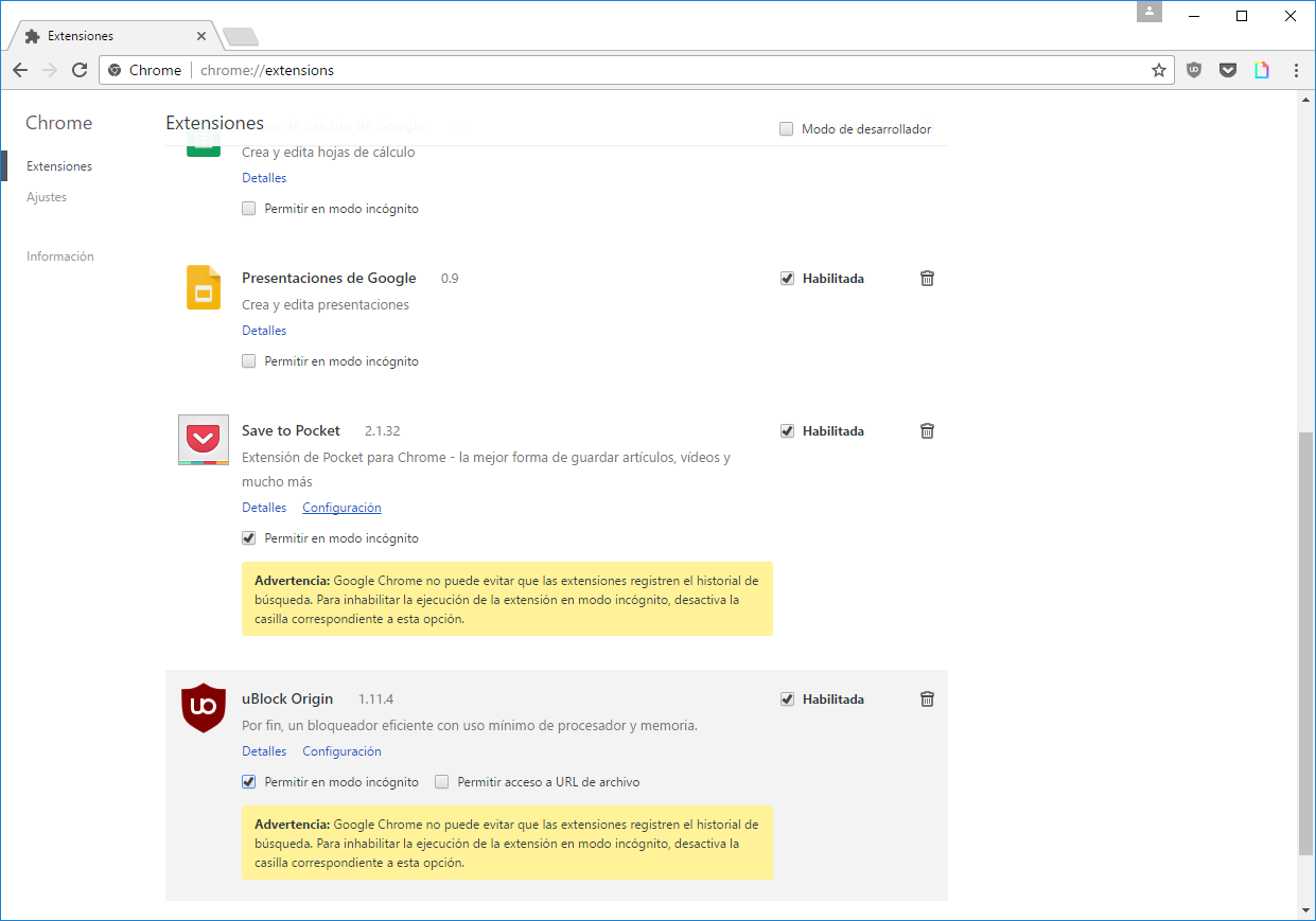 Debajo de las extensiones habilitadas aparecerá un mensaje de advertencia, que nos advierte de que Chrome no puede evitar que dichas extensiones registren el historial de navegación.