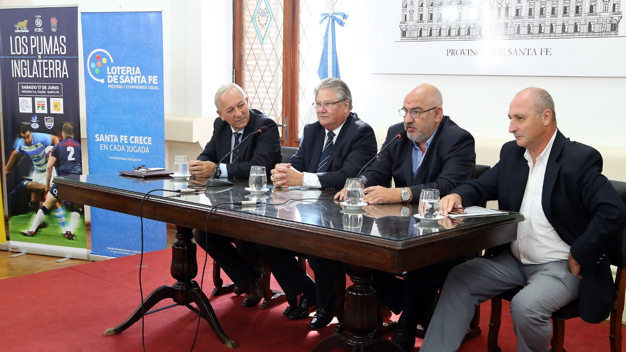 El vicegobernador de la provincia, Carlos Fascendini, presidió este martes en Casa de Gobierno el acto de presentación del partido internacional que el próximo sábado 17 de junio jugarán en el estadio “Brigadier López” del Club Atlético Colón de Santa Fe, los seleccionados nacionales de rugby de Argentina e Inglaterra.