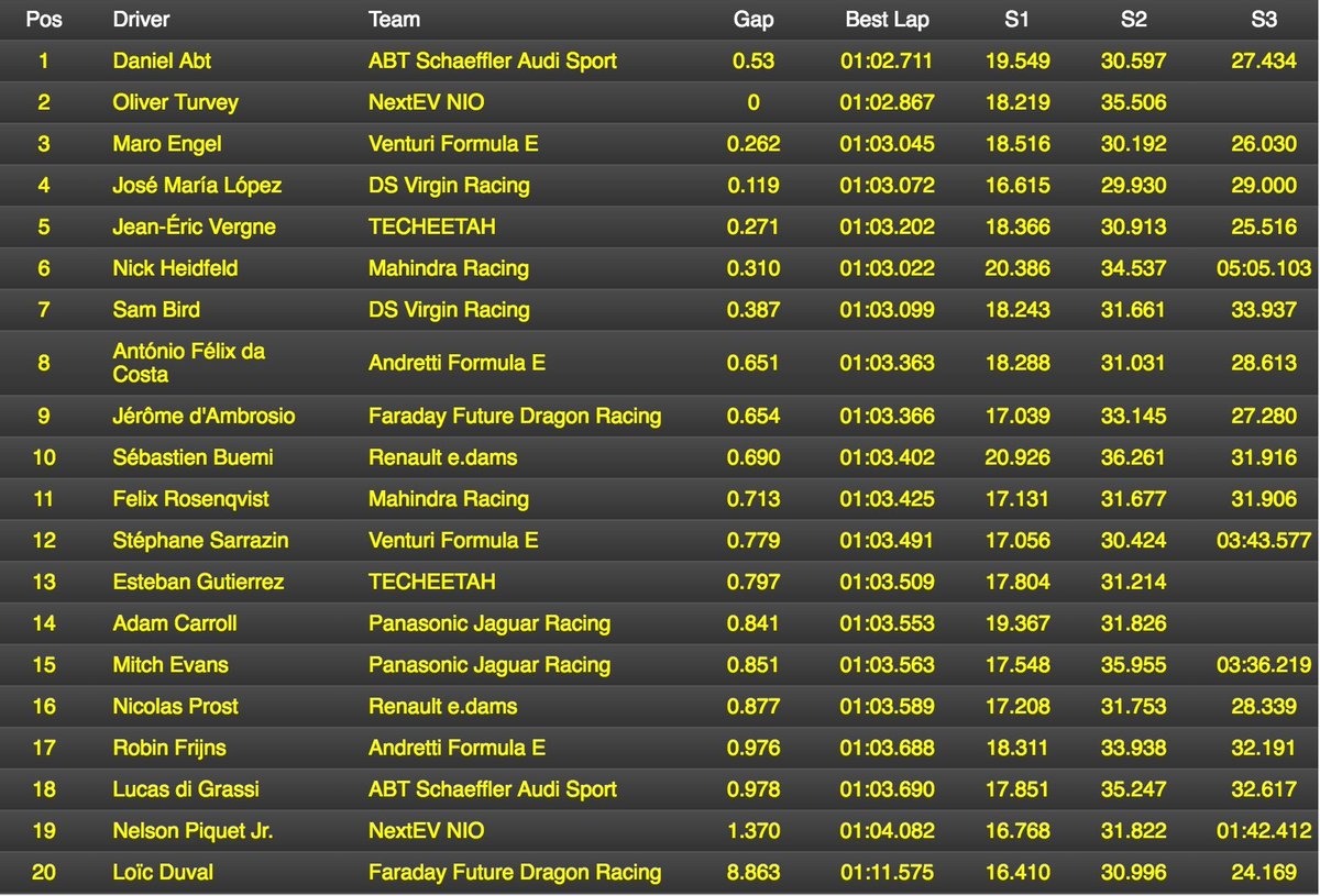 Sin embargo, Daniel Abt (ABT Schaeffler Audi Sport), quien obtuvo el mejor tiempo en la clasificación, también deberá penalizar debido a que la presión de neumáticos se encontraba fuera del reglamento. Por lo tanto, el cordobés comenzará la competencia desde el segundo cajón de la grilla.