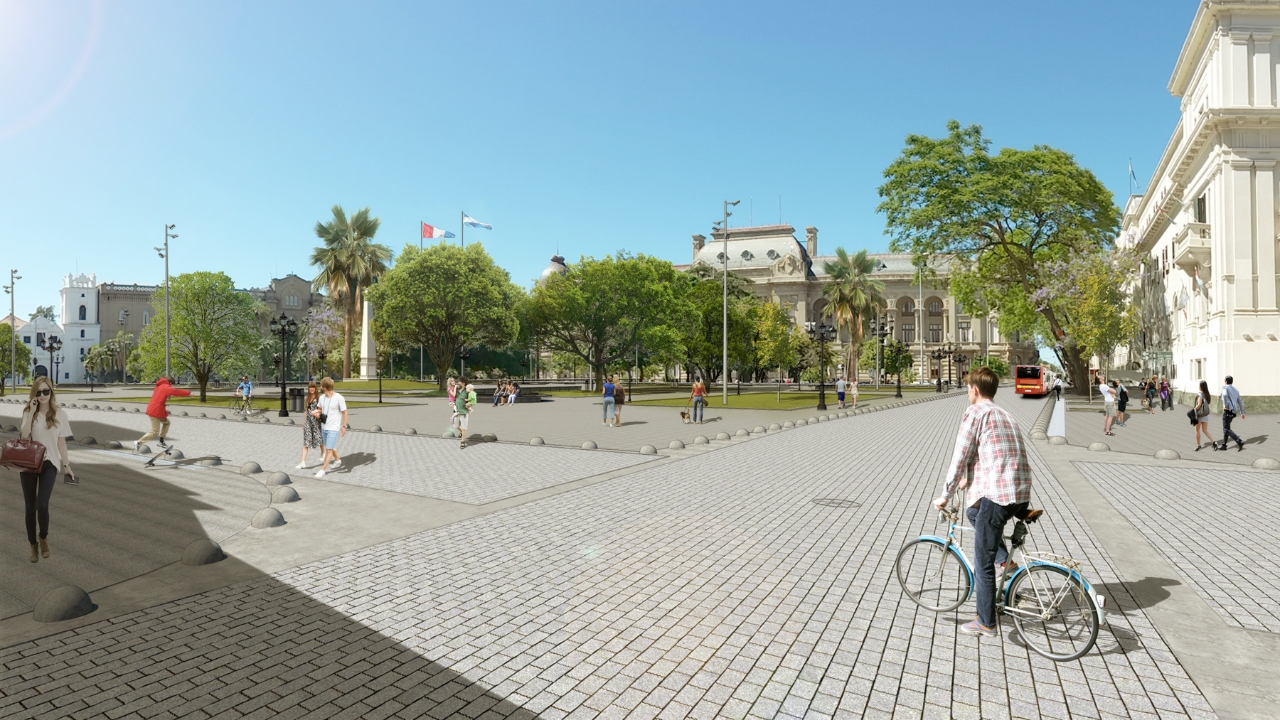 En lo que refiere a las características arquitectónicas de la obra, se trabaja con un plano de piso continuo, recomponiendo el espacio físico original de la plaza, disolviendo el entramado de calles existentes e integrando, de esta manera, el perímetro compuesto por los edificios representativos de la actividad política, jurídica y religiosa existentes en sector. De este modo, “se restringen sectores de estacionamiento de vehículos priorizando el uso peatonal. Las veredas del perímetro edilicio construido se van a fundir para ser parte de la plaza misma, con diversos tratamientos de solados a nivel", describió el secretario de Planeamiento Urbano, Marcelo Pascualón.