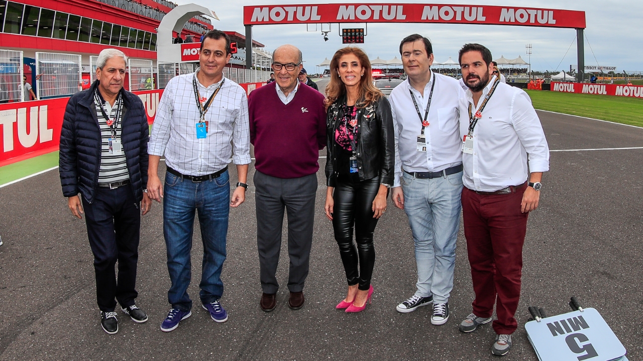 El Secretario de Turismo de la Nación, Alejandro Latra, junto a la gobernadora de Santiago del Estero, Claudia Abdala de Zamora; su par de San Juan, Sergio Uñac, el presidente de la Cámara Argentina de Turismo, Oscar Ghezzi, el subsecretario de Promoción del Ministerio de Turismo de la Nación, Fernando García Soria, y el CEO de DORNA, Carmelo Ezpeleta participaron en la jornada de cierre de la competencia argentina de MotoGP en el Autódromo internacional Termas de Río Hondo en la provincia de Santiago del Estero.