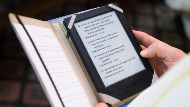 (Lee la Biblia en digital) es un tipo de lectura plana, algo para lo que no fue escrita la Biblia. Terminas leyéndola como si fuese Wikipedia, más que un texto sagrado"