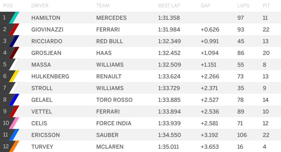 Por otra parte, hubo dos Ferrari en la pista porque Vettel participaba en los test de Pirelli con los prototipos para los neumáticos de 2018 y sin probar mejoras en el coche. Tuvo algún problema mecánico que limitó su tiempo de prueba.