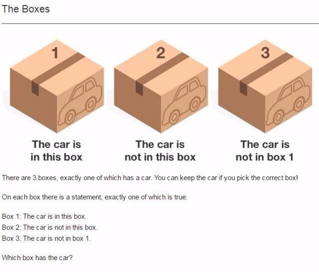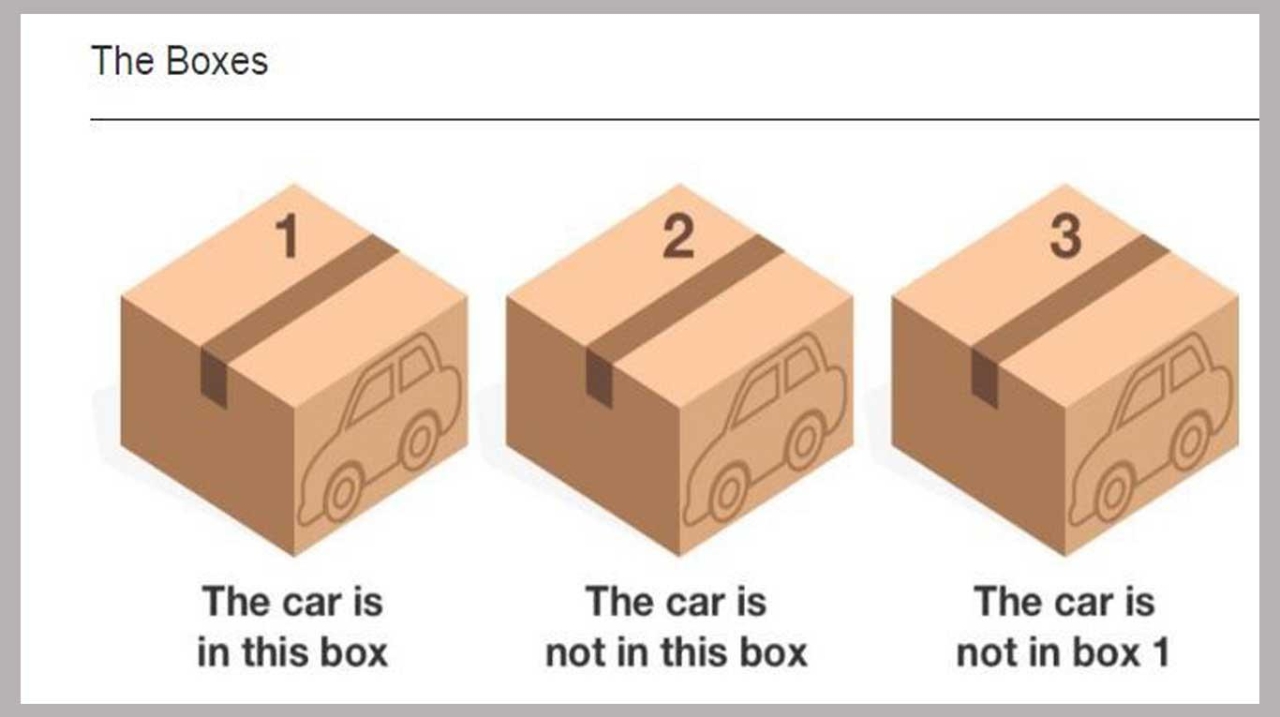 • Si el auto estuviera en la caja 1, los enunciados de la cajas 1 y 2 serían verdaderos, pero al ser verdadero, tan solo uno de ellos puede serlo: entonces no está en la caja 1.